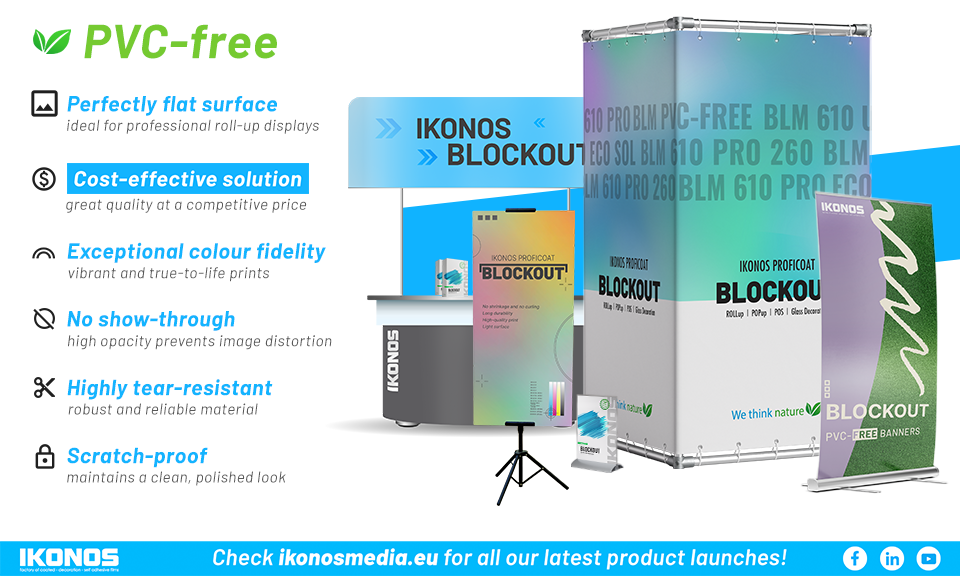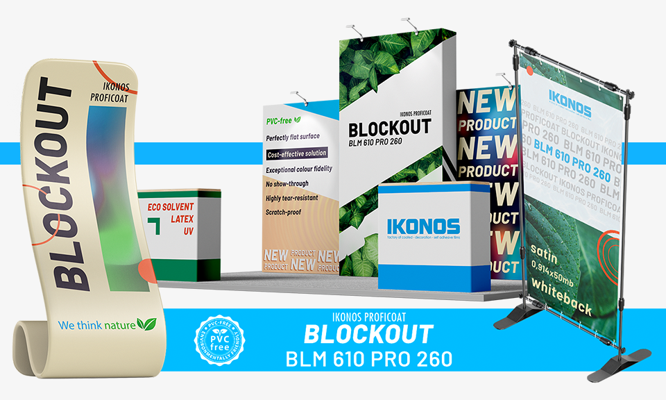 Ikonos Proficoat Blockout BLM 610 PRO 260. The ideal medium for all roll-up, pop-up & POS applications. This reliable and cost-effective material delivers excellent print quality with high durability and very high opacity. The top quality printing product for large format inkjets. It is white, satin, polypropylene film, modern printing substrate. The material is recyclable and 100% PVC-free.